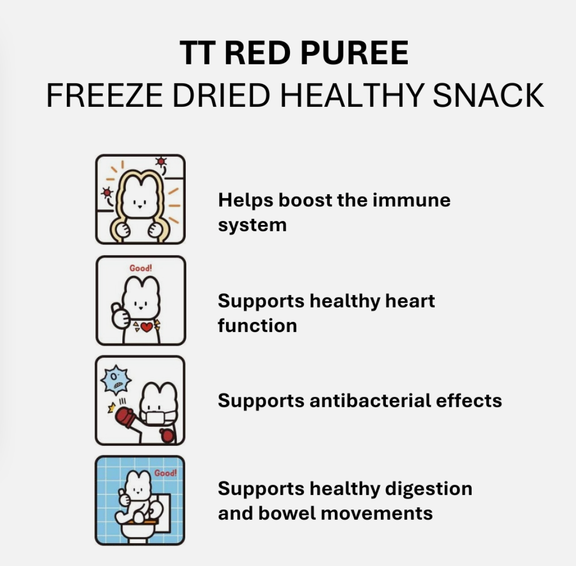 High Four’s TT Red Puree is made with Sweet potato, Banana, Beet, Carrot, and Strawberry, then gently freeze-dried to lock in nutrients and natural flavor.